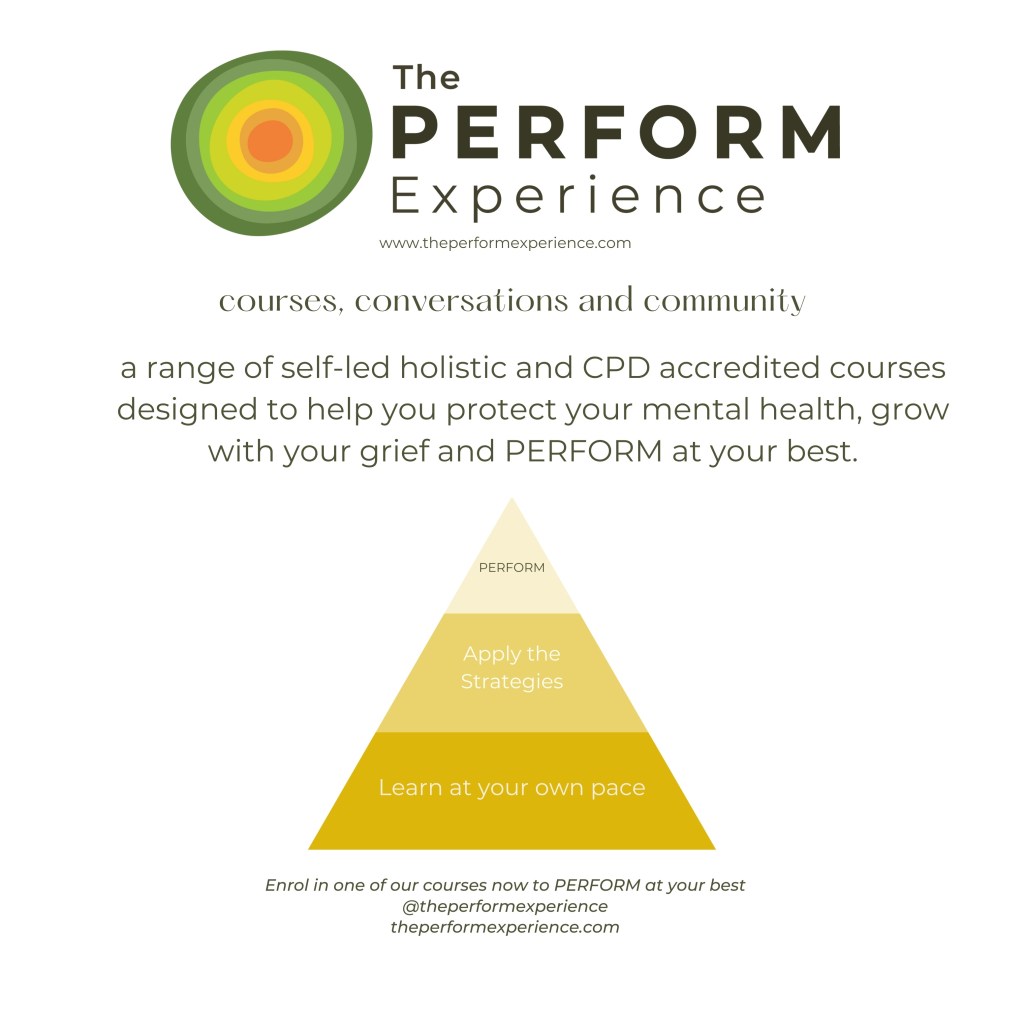 The PERFORM Experience ® shares this PERFORM framework through courses, books, resources, workshops and talks with the intention of empowering people to become emotionally fitter, protect their mental health and PERFORM at their best, building resilience so they can manage stress and difficult situations in life and work.